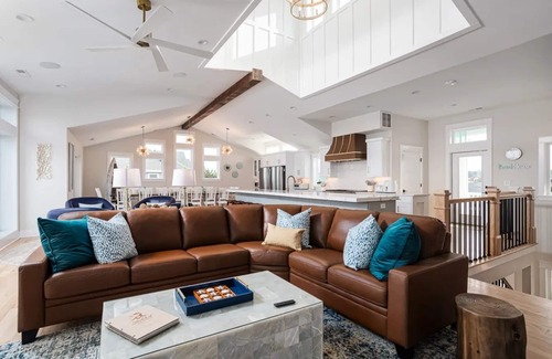 The great room on the third floor of the main home is spacious, with many windows to allow the gorgeous ocean view to fill the space. The living area is comfortably furnished and invites you to kick back and relax with loved ones. An electric fireplace is available for use during the cooler times of the year. The kitchen is a cook’s dream and is equipped to accommodate large groups. There are two refrigerators, two dishwashers, and plenty of counter space. Getting groceries from the ground floor to the kitchen on the top level is made easier by using the elevator. Big family meals can be enjoyed together in the large dining area. Just outside on the sun deck, enjoy your morning coffee with a sunrise over the ocean. An additional covered deck is available as well. There is one master bedroom on the third level, which includes a private bathroom and access to the deck. A half bathroom completes the top floor of the main home.