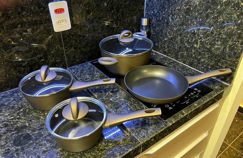 Cozinha equipada com louças, copos, talheres, panelas, micro-ondas, fogão, Nespresso.