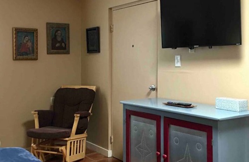 We welcome you to our cozy guest house in the heart of Downtown Las Cruces. Perfect for overnights with dogs or kiddos! Close to shopping, the Farmer's Market, and centrally located to enjoy all Las Cruces has to offer. You will have a private entrance, off-street parking, and a fenced yard to yourself. There is a queen bed and a pack-n-play as requested. There is a small kitchenette with a fridge, microwave, sm hot plate, and sink and the casita is equipped with utensils and the basics for you.