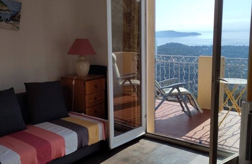 (Text automatically translated) studio equipped (dishes, blankets and pillows for new sofa bed, table chairs and 2 armchairs) with balcony overlooking the bay and the surrounding hills, swimming 20 meters and tennis courts lower in the countryside. Stunning views. Stop in front of the residence of the free shuttle to the summer beaches and city access