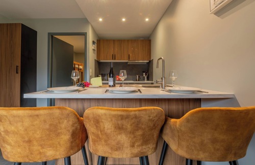 The décor is contemporary with an open-plan living/dining/kitchen area. Double glass doors lead out onto a private balcony with panoramic mountain views. Indoors, the living room has a sofa and a breakfast bar for relaxed meals. The kitchen is well equipped with a cooker hob, oven, microwave, dishwasher, coffee machine and fridge/freezer.