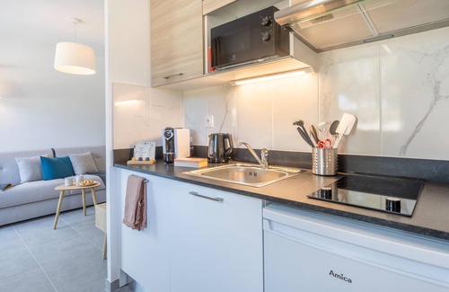 Layout: Kitchenette(electric kettle, toaster, coffee machine, dishwasher), Living/bed room(double sofa bed, TV(international television channels)), bathroom(shower, toilet, hairdryer), balcony or terrace, air conditioning, parking, swimming pool(shared with other guests, heated, including part for children (depth 50cm), opened from May upto and including Sep), boules court(shared with other guests)