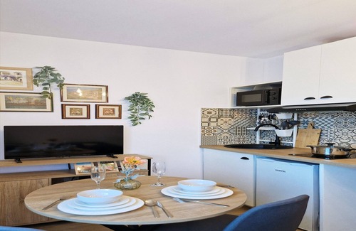 Located in the vibrant Cartoucherie district, the "Chérubin" studio offers a cozy and well-equipped space perfect for your stay in Toulouse. Just a 5-minute walk from the Tram and 2 minutes from the bus stop, you can easily reach the city center in 15 minutes. Enjoy the freedom of autonomous check-in from 5 p.m. with a key box, and reach out to the host until 8 p.m. for any assistance. The studio is thoughtfully designed for comfort, featuring a comfortable 140x190cm bed, a warm dining area with a table and chairs, and a television with high-speed Wi-Fi. The adjoining bathroom includes a shower, toilet, and sink for convenience. The kitchenette is fully equipped with a fridge-freezer, microwave, electric hob, kettle, coffee maker, kitchen utensils, and pots and pans, allowing you to prepare meals with ease. Additionally, a washing machine is available for your laundry needs. Ideal for both work and leisure, this charming studio is the perfect base for exploring Toulouse or teleworking in comfort.