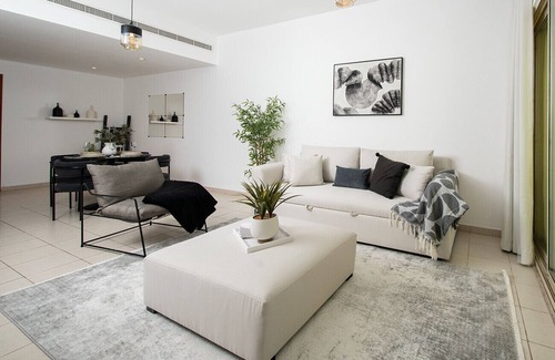 Modern 1-bedroom apartment in Al Dhafra 2, The Greens. Features a cozy living room with sofa bed, fully equipped kitchen, dining area, and balcony with community views. Bedroom includes a comfy double bed and ample storage. Enjoy high-speed Wi-Fi, TV, A/C, and access to the pool, gym, and landscaped gardens. Prime location near Dubai Marina, Mall of the Emirates, and metro. Perfect for couples, families, or business stays.