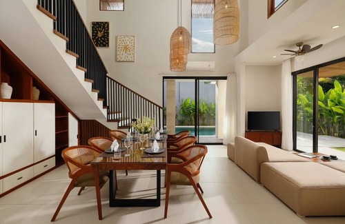 Upon entering the villa, you are greeted by a harmonious fusion of Japandi modern design and Balinese culture. The spacious ground floor features a living area that seamlessly flows into the dining space, where you can enjoy meals prepared in the fully-equipped kitchen. A cozy corner invites relaxation, and a convenient toilet is nearby for your comfort. The villa is more than just a villa; it's a sanctuary where modern comforts and natural beauty converge, offering an unforgettable stay in Seminyak.