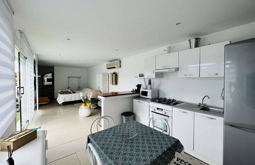 This bright villa is composed of a spacious living room with living room, an open-plan kitchen, a utility room, a pantry, three bedrooms with shower room/wc, one of which is T2 with a fitted kitchen and access from the outside. .