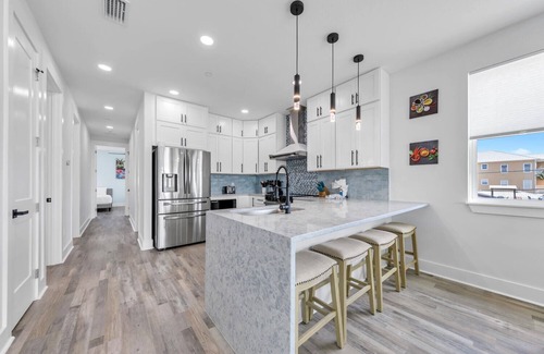 The first floor offers a large gathering space with a Game table that includes pool, ping pong, and air hockey and a Foosball table for hours of fun that also conveniently allows access to the back patio and the private pool. The first floor also includes a queen bedroom and en suite, another full bathroom, an office work space and the first of two laundry rooms. The second floor offers the large open kitchen, living and dining area for family dinners, balcony to enjoy morning coffee or evening sunset watching. There is also a guest bedroom with a queen bed and another guest bedroom with two queen beds, as well as, one full bath and one half bath. The third floor brings you to the beautiful cozy King master with a private ensuite with exquisite high end finishes and a private balcony over looking the emerald green water of the Gulf! Further down the hall on this floor is a Wet Bar area with a wine cooler, a second laundry room and two more bedrooms - One bedroom with a Twin over king bunk and one with two more queen beds, and another full bathroom. In total, this unit can comfortably sleep up to 17 guests.