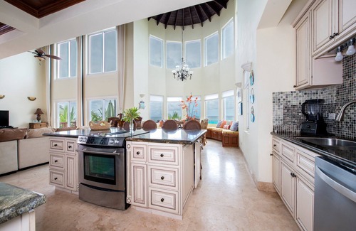 Enjoy the expansive, modern Great Room luxuriously decorated in a contemporary style. The room features 26 feet of cathedral ceiling with windows that showcase the Bahamian waters and clear skies. Sit back and watch your favorite movies in high definition Blu-Ray and DVD.