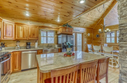 This rustic lodge is just the place to call home for your next family vacation or a relaxing getaway with friends. The wood accents and high ceilings create an airy atmosphere while still keeping a traditional cabin ambiance. The wood-burning fireplace is perfect for reading a book by with a cup of hot chocolate and the expansive deck complete with a hot tub looks out to the lush foliage that this area is famous for. Exploring outdoors is a blast here, yet inside also has a plethora of activities like playing pool, watching a movie, or playing some classic video games on the arcade console. The full kitchen is equipped with everything you need to make memorable meals and it has bar seating at the island to make preparing a meal a time to visit with loved ones as well.
