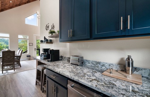 The fully stocked galley kitchen includes stainless steel appliances, granite countertops, and all the essentials for cooking romantic meals. The large dining table doubles as a perfect spot for meals, work, or games. Coffee lovers will adore the custom coffee bar with a Keurig Duo, Nespresso Vertuo, and milk frother.