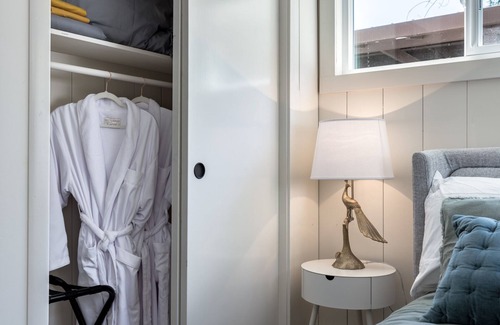 >The PRIMARY room has a full size bed, two cozy white robes to help you feel right at home plus a reading nook and TV for