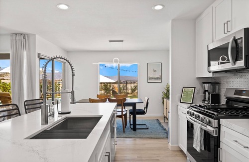 Welcome to your stylish oasis of mid-century modern charm that sets the tone for a remarkable vacation. The spacious living room beckons you to sink into its comfort, allowing you to indulge in your favorite movies or shows. Meanwhile, the expansive, updated kitchen provides the perfect stage for showcasing your culinary prowess, all while overlooking the picturesque backyard with mountains in the distance.