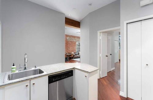 This eye-catching residence within the former Citrus Soap Company factory, gives you all the vibes of a trendy New York loft, while still reaping the benefits of that San Diego sunshine. The era-specific, oversized industrial windows, along with the exposed brickwork and wooden beams, preserve the story of the building's original life, as well as providing incredible natural lighting and historic charm. High ceilings throughout the unit imbue it with an open, airy feeling that is complemented by the minimal-yet-luxurious furnishings chosen for the space. The living room centers on a cozy fireplace with a Frame TV gracing the wall above it and flows into the dining area that offers a bar car equipped with a full set of drink-crafting accoutrements, ideal for entertaining. Expansive granite countertops can be found in the kitchen along with two convenient pantries. An inviting king size bed is the focal point of the primary bedroom, that also boasts ample storage space in the form of two double-door closets with built-in shelving, and an en-suite bathroom with a dual sink vanity and jacuzzi bathtub. Elegant French doors provide entry to the guest bedroom that houses an adjustable standing desk, perfect for those looking to work from home, a plush queen size bed and two dressers.