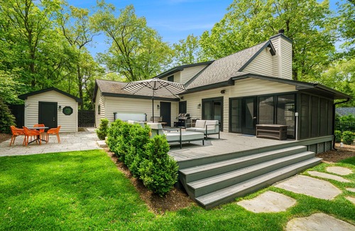 Beautifully nestled on a three-quarter acre lot near the shores of Lake Michigan, treat yourself to a peaceful lake getaway with this Grand Beach home! Boasting lavish amenities and room for the whole family, spend your days next to the private pool (with a slide) or stargazing from the hot tub. The lovely outdoor space also features a comfy firepit area, grill, lush lawn, expansive porch, and yard games, creating the perfect backdrop for spending time with loved ones in the warm sunshine. There’s even a golf cart available during the summer! When looking to explore, you’ll find Woodlands Course at Whittaker, Friendship Botanic Gardens, and Washington Park Beach & Zoo all within about nine miles.