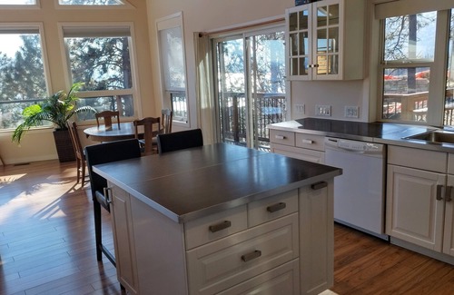 Multiple outdoor spaces with 500 square feet of deck on two levels (loft bedroom has its own deck) so you can always find just the right amount of sun or shade. Two outdoor dining areas — one is covered and privacy-screened in case you have had enough sun (or it rains!) and the front deck dining table offers a truly incredible 180-degree view of the lake. The modern kitchen with island is fully equipped and conveniently connects to the outdoor BBQ area. Super easy to create your own amazing lakeview dining experience.