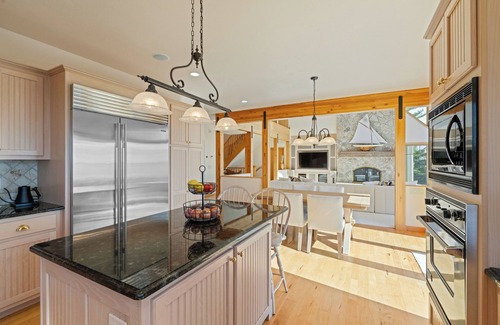The kitchen is large and modern, equipped with an oversize Viking stove and refrigerator, dishwasher, Keurig coffee machine, blender and just about anything else you would need for a fantastic family dining experience. The kitchen also has a walkout to the outside deck overlooking the lake. The kitchen table pictured shows seating for six, but with additional leaves, the table can easily seat 10-12 (extra leaves and chairs on lower level).
