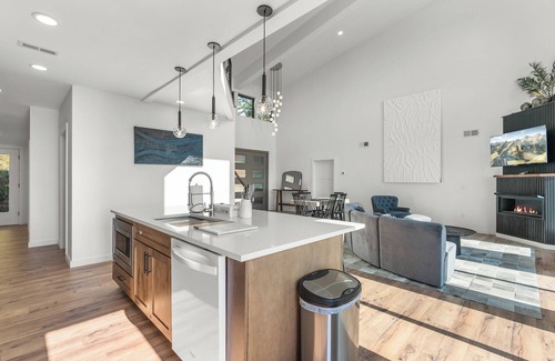 Inside, you’ll find a spacious living area with large windows, high ceilings, and a cozy fireplace. The fully equipped kitchen is perfect for preparing meals, which you can enjoy at the dining table while taking in the stunning vistas.