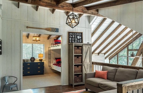 Upstairs the open loft is perfect for children (play table, books, toys, puzzles, games) or to put your feet up on the couch w/ chaise & read or nap. 3 BR upstairs. One, a 2nd master w/ King bed/attached bath (shower/tub) & tv. Another, an adorable bunk room (4 twin beds) w/ tv. The final BR has a crib & glider/recliner for reading or rocking baby, plus a Queen bed.