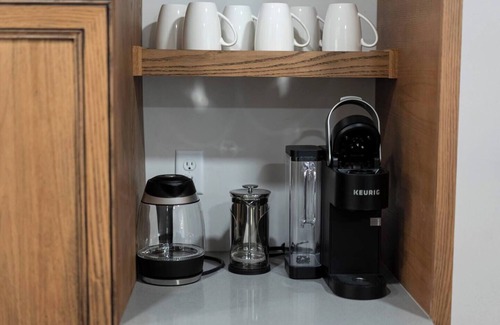 3. What does the kitchen include? - The kitchen has all new appliances including a dishwasher and microwave and is fully stocked with normal kitchen items plus a crock-pot, rice cooker, roasting pan, waffle maker, toaster, blender, a Keurig and a French Press, Tea Kettle, various size pots & pans, meat thermometer, turkey baster, mixing bowls, glass pie pan, baking sheets, and a rolling pin.