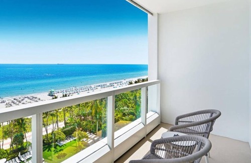 Wake up to the breathtaking beauty of the Atlantic in this oceanfront junior suite on the 8th floor of the Sorrento Tower at the Fontainebleau Resort. Enjoy a front-row seat to the beach, boardwalk, and stunning sunrises from your private balcony—an ideal setting for peaceful mornings and unforgettable views.