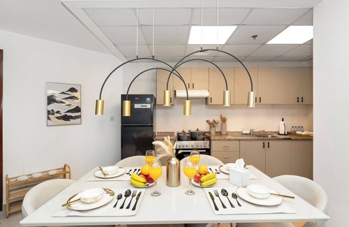 You'll find yourself surrounded by modern furnishings, elegant decor, and top-of-the-line amenities to make you feel at home. Cook up a storm in the fully equipped kitchen with high-end appliances and dine at the chic and stylish breakfast bar. Retreat to the cozy bedroom for a peaceful night's sleep on the plush king-sized bed, adorned with luxurious linens. The modern bathroom features a large walk-in rain shower and premium toiletries for a spa-like experience. Whether you're in town for business or leisure, Bahr alSahara Home elevates your stay to new heights. Book now and discover the true meaning of luxury.