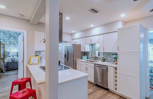 This home is undoubtedly uniquely furnished with FOUR bedrooms and THREE FULL bathrooms---PLUS we have a new poolside guest bungalow which will bring the bedroom count up to FIVE BEDROOMS! The home has multiple sitting areas, which really makes this ideal for large families. There are not one but TWO cozy poolside cabanas---both with their own Smart Roku TVs! One of the cabanas has its own beverage refrigerator and seating for outdoor dining. There is a propane grill, a large fire pit area AND an oversized chess board as well. This home has EIGHT Smart TVs with wireless internet so log right into your apps and watch your favorite shows or stream music! Wait until you walk into this beautiful home---you'll be blown away with its cheerful colors and different themes in each bedrooms.