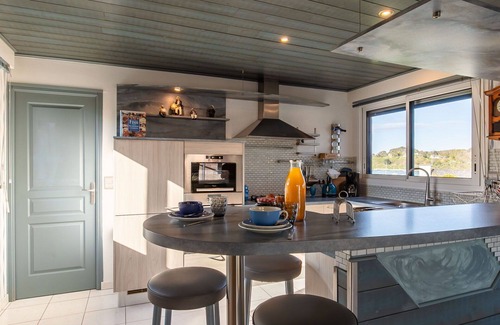 The open kitchen is well-equipped with a hot plate, oven, 3 gas rings, toaster, kettle, microwave, freezer, and an electric coffee machine. There is a shower room, separate toilet, and double hand basin. Electric heating keeps the house warm and comfortable. Outside, you'll find 3 terraces, terrace furniture, a barbecue, and 2 deck chairs, offering stunning views of the sea and the Térénez peninsula. Additional amenities include a washing machine, dryer, baby cot for up to 2-year-olds, and free WiFi internet access.