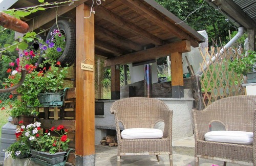 "Casa Kiwi", 2-room house 55 m2 on 2 levels. Comfortable and cosy furnishings: upper floor: (exterior staircase) living/sleeping room with 1 double sofabed, dining table, satellite TV, radio, CD-player and heating stove. Exit to the balcony. Open kitchen (oven, dishwasher, 4 gas rings, toaster, kettle, microwave, freezer, electric coffee machine). 2nd upper floor: open, 1 room with 1 x 2 bunk beds, 1 french bed (160 cm), shower/WC and air conditioning. Gas heating. 5 small balconies. Balcony furniture, barbecue, deck chairs (4). Beautiful distant view of the mountains, the valley and the river. Facilities: washing machine, iron, children's high chair, baby cot for up to 2 year olds, hair dryer. Please note: non-smokers only. Maximum 1 pet/ dog allowed. Private entrance. CIR: 014017-CNI-00002