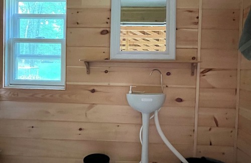 The barn is open plan, with a bedroom and sitting room and small coffee station. There is a foot pump sink (otherwise no running water) and a composting toilet. Minimal electricity is provided.