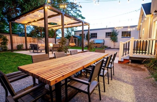 The Shelly House is a private home with all of the perks and pleasures for you to retreat, relax, reset and revive yourself, providing all the pleasures, The mesmerizing backyard lounge features a pergola with couches and hanging chair, a huge gas fire pit and a hot tub. Don't forget the BBQ! Don't want to go out? It's all there, four Sonos speakers, tons of streaming services, two built-in desks.
