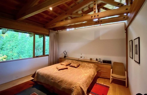 The Professional kitchen has a stainless steel fridge, dishwasher, oven, and grill—beautiful and spacious decking off the main floor. Extensive glass provides panoramic views of the outside natural forested environment. The high ceiling main floor gives a relaxed and stunning feel to the property.