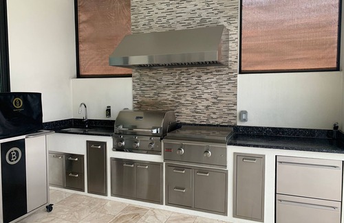 Step outside to your private, heatable pool, where you can bask in the Florida sun or enjoy a refreshing swim. The outdoor area further complements your stay with a sophisticated BBQ setup and an outdoor kitchen, ideal for hosting memorable poolside parties or serene evening dinners under the stars.