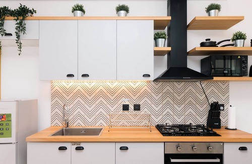 A living room and air conditioning are featured at this 1-bedroom, 1-bathroom rental. Bathroom amenities include a hair dryer, towels, and toilet paper. The kitchen is equipped with an oven, a stovetop, and a refrigerator, as well as an electric kettle, a microwave, and cookware. And you won't have to pack extra clothes, because you'll also have a washing machine.