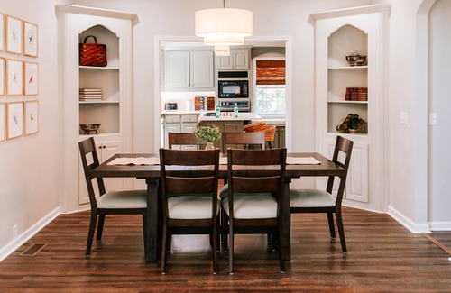 The fully stocked kitchen features stainless steel appliances, a Smeg toaster for a hint of retro charm, and all the cookware, utensils, and cleaning supplies needed to prep anything from quick breakfasts to Southern-style dinners. The dining area seats six comfortably.