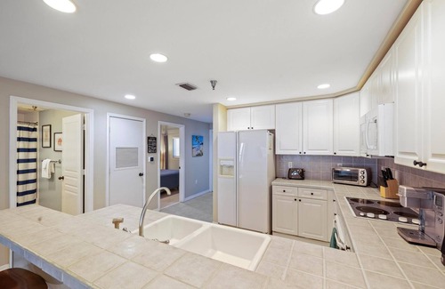 The serene master suite offers a King bed, private ensuite bathroom with a shower/tub combo, and its own access to the balcony, making it a tranquil retreat. The guest bedroom features a cozy Queen bed, and both bedrooms come equipped with flat-screen TVs for added convenience. A second full bathroom with a shower/tub combo is located just off the hallway.