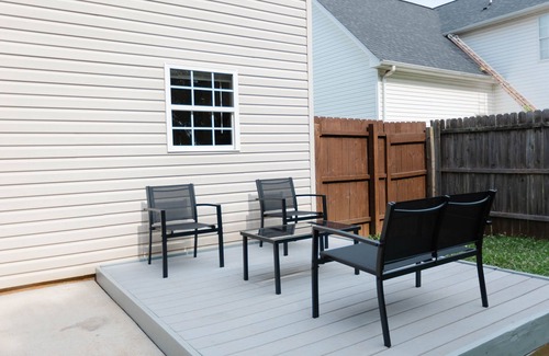 Walk out to the beautiful fenced in backyard for your enjoyment. Gas propane grill available to use. Seating area in the backyard to sit and enjoy the beautiful weather with your friends and family. Backyard facing the peaceful woods with a gate entry to the backyard and a little creek past the fence for a nice walk.