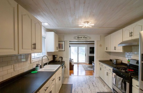 The Hideaway will feel like your home away from home. The house features a large eat-in kitchen & cozy living area, converted garage with well-equipped gym, office area and family entertaining space. Central air conditioning will keep you cool in the summer and two fireplaces (one gas, one electric) keep you warm in the cooler months. With access to Wi-Fi, three Smart TV's with Roku, DVDs and lots of books, you will not be without entertainment on rainy days. Outside, there is space for everyone to enjoy a delicious grilled feast, and tell stories around the propane fire bowl.
