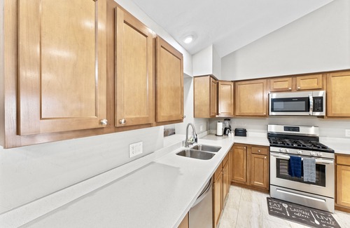 Recently upgraded and beautifully furnished throughout, this spacious and private three-bedroom home features an open floor plan with a modern kitchen, counter-height seating, dining area, dedicated workspace, and a family room with 55” Smart TV.