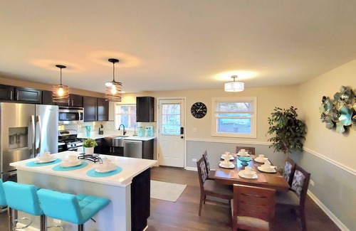 Stylish Modern Spacious Two Level House, 4 Bedroom 2 Full Bathrooms, on a quiet street in Schaumburg. Great Location. Sleeps 8 people. Enjoy family time at this peaceful and renovated stylish space. The house is equipped with new kitchenware, Stainless appliances, smart TVs and fast internet. Open kitchen with a breakfast bar. 7 miles to Schaumburg Convention Center, 18 miles to O'Hare Airport, 6 miles to Woodfield Mall. Enjoy restaurants, parks, golf courses, Legoland, Medieval Times and much more. Garage is not available for guests' use. The house has stairs.