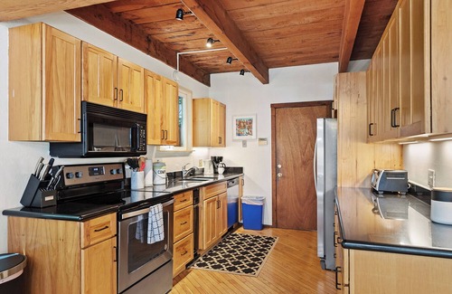 You will love Hank's Hideaway! New owners capture a youthful charm with new furniture and decor. Open the front door and you'll feel at home. The galley kitchen opens to the dining and living room so no one is left out of the conversation. Take meals outside to one of two large decks and sit among the trees with the BBQ and hot tub. Follow the deck around the house and relax poolside - or hop in!