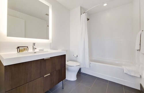 This newly designed two-bedroom apartment features floor-to-ceiling windows, hardwood floors, granite counter-tops, upgraded stainless steel appliances and front-loading washer/dryer in the residence. All beds provided are fitted with plush linen sheets and pillows. All Furnished Quarters apartments include 24/7 guest service.