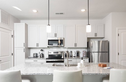 This stunning rental apartment features two bedrooms, each with a comfortable queen-sized bed, a spacious walk-in closet, and a desk area in each bedroom. The master bedroom also includes an ensuite bathroom with a walk-in shower. The bedroom features a tub/shower combination with a vanity. With ceiling fans, this apartment feels spacious and open. Pendant lights add a touch of elegance to the modern kitchen, which includes an island and two barstools and comes fully stocked with cooking utensils. The glass dining table accommodates up to four guests.