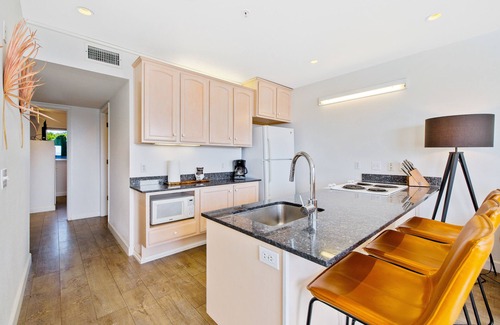 At Bungalow 230, you’ll find a stylish, sunny space on the second floor, offering equal parts vintage beach-town vibes and modern, luxury living. The well-equipped kitchen features a full suite of appliances, and there's plenty of room to dine together between the kitchen barstools and window-front bistro table. The living room offers lots of space to kick back and relax at the end of a fun day. Entertainment options include three streaming-capable TV and WiFi, but evenings are best spent with a cocktail on your balcony, enjoying a spectacular sunset. Visit the shared firepit and grilling area for an easy dinner, or step out to one of many local restaurants within walking distance. Whether you’re in town to surf, shop, hike, or just unwind at the beach, you’ve found the perfect home base at the Pier View Suites.