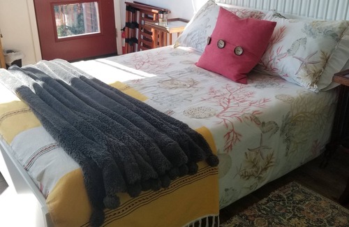 Perfect for a single or couples that will be comfortable on a double size bed. This charming room is warm and cozy with spectacular views of the Russian River opening into Goat Rock Beach. Situated in a private, quiet setting in the enchanted village of Jenner, it is within walking distance to the shops, cafe's and restaurants. The Jenner Headlands Preserve is within walking distance to the trials or a short 3 mile drive to the parking lot and trial heads.