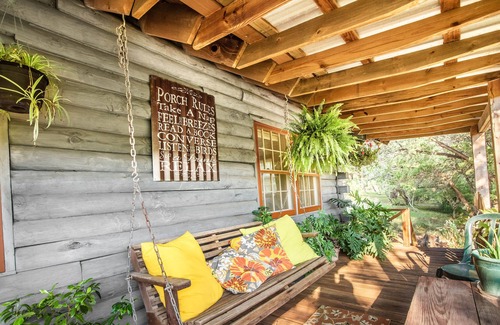 The cabin is spacious with a very open floor plan. The fully stocked kitchen has everything for your cooking needs including basic spices. Several beverages, bottled water, coffee & tea are provided for guests. There is a large open dining area inside with a table for 6 or, you can dine on the porch where there is a propane grill. The large bedroom has a king-sized comfortable bed. There are two queen-sized futons in the living room. The bathroom has a claw-foot tub and an outside shower is located just off the porch. Bath products are organic. There are many special touches to make this property second to none. You'll find all the comforts of home: central air, high-speed/wireless Internet, satellite TV and even an Alexa and Bluetooth speakers for music.