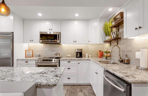 Sink into the new large sofa to watch your favorite shows on the 55" smart TV or just cozy up with your favorite book. Continue outside to your private patio oasis! Dine outdoors under the stars or privately soak up the sun with a good book and cold drink. There is a newly remodeled half bathroom downstairs. The ceiling fans, flat screen TVs, cable service and FREE WiFi will also enhance your vacation experience. The upstairs has new wood flooring and offers two generously sized bedrooms.