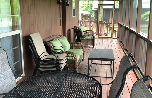 Cabin boasts new large covered porch, campfires in the backyard and short walk down the hill to the lake. Two bedrooms with queen beds and a large loft with two twin beds and futon bed. Full bathroom with shower/tub, washer and dryer in the cabin. Well stocked kitchen with table for six (extend leaf available for more). 50 INCH TV with streaming and 48 inch TV in loft with X-box system. Free Wireless internet There is not a dock to use with this rental.