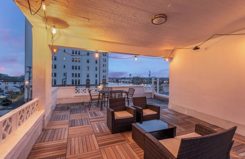 Multiple outdoor spaces create the perfect summer retreat. The private roof deck offers stunning views of Deal Lake and is ideal for alfresco dining and evening relaxation. A charming porch extends off the king bedroom, providing another vantage point to enjoy the lake views. For morning coffee and breakfast, a small intimate patio creates the perfect spot to start your day. The bright sunroom bridges indoor and outdoor living, allowing you to enjoy the surroundings year-round regardless of weather. The property's vintage character extends throughout these thoughtfully designed spaces with comfortable seating areas and tasteful landscaping.