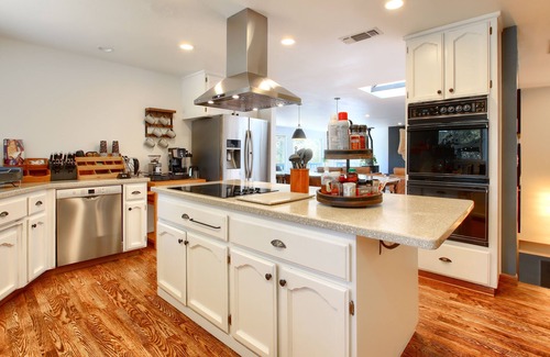 Gourmet Kitchen: Fully stocked with new appliances, island seating, coffee bar with complimentary K-Cups, toaster, and quality dinnerware.