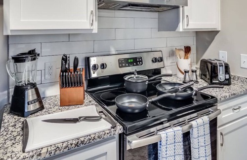 Toaster, French Press, Kettle, Tea, Coffee, Blender, Rice Cooker, Baking Sheets, Mixing Bowls, Pots and Pans Set, Drinking Glasses, Wine Glasses, Full Cutting Knife Set, etc.